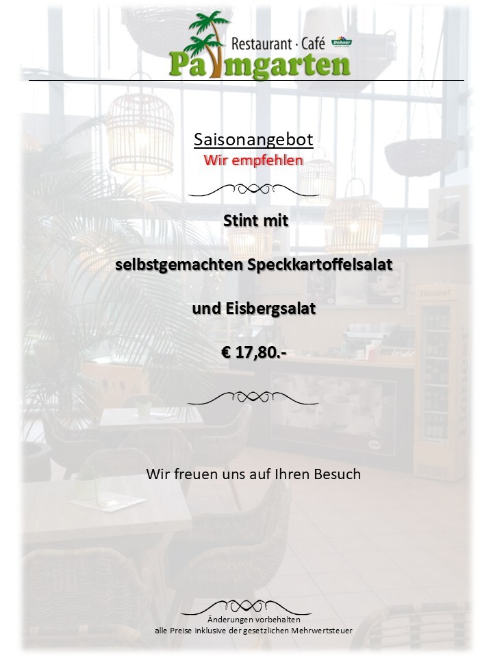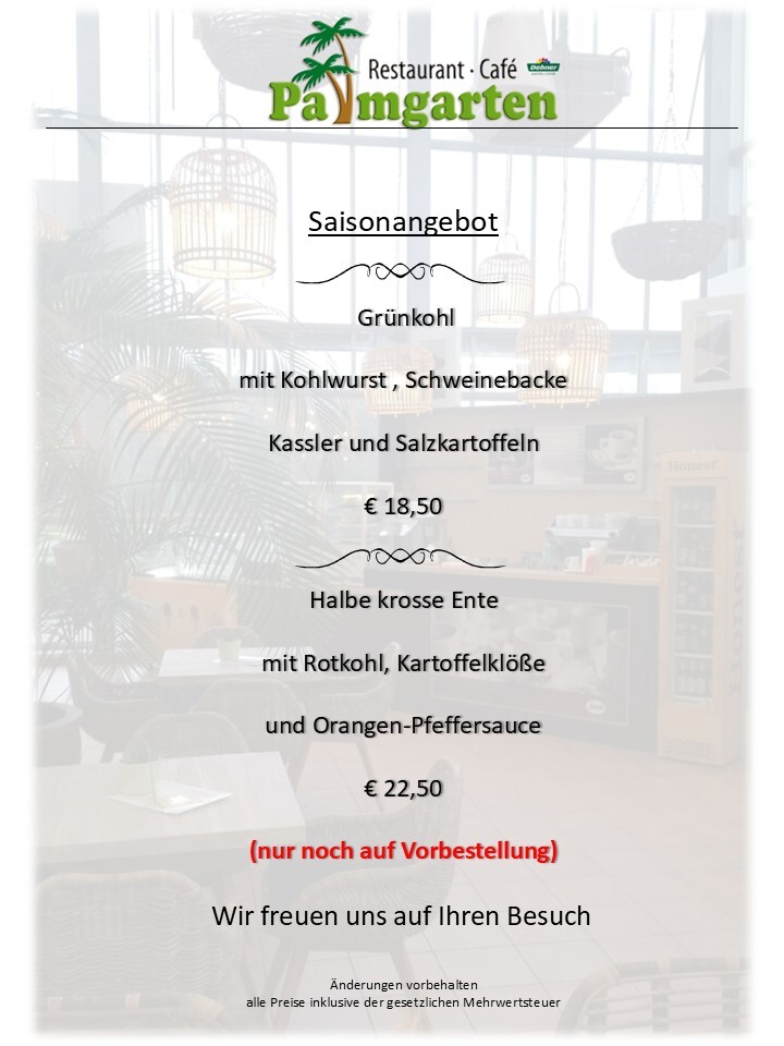 Oder Sie besuchen uns, um bei einem persönlichen Gespräch in aller Ruhe eine für Ihren Anlass maßgeschneiderte Lösung zu erarbeiten. Wir möchten Ihr Vertrauen gewinnen. Sie sollen überzeugt sein, dass Sie mit uns „Restaurant Café Palmgarten“ den richtigen Partner gefunden haben. Unser Repertoire an Vorschlägen für z.B. Empfänge, Buffets oder gesetzte Essen im privaten oder geschäftlichen Rahmen, ist im Wesentlichen vielfältiger als unser Katalog aussagen kann. Hier handelt es sich lediglich um einen Einblick in unsere Möglichkeiten die im Übrigen nicht bei der Wahl der Speisen schon enden.