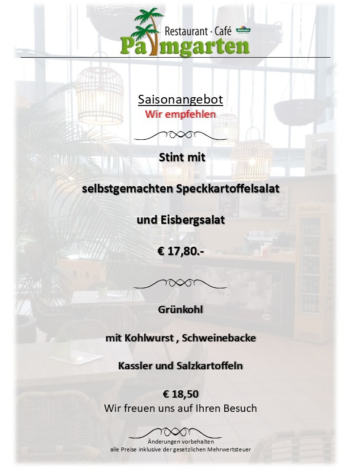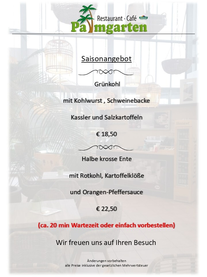 Oder Sie besuchen uns, um bei einem persönlichen Gespräch in aller Ruhe eine für Ihren Anlass maßgeschneiderte Lösung zu erarbeiten. Wir möchten Ihr Vertrauen gewinnen. Sie sollen überzeugt sein, dass Sie mit uns „Restaurant Café Palmgarten“ den richtigen Partner gefunden haben. Unser Repertoire an Vorschlägen für z.B. Empfänge, Buffets oder gesetzte Essen im privaten oder geschäftlichen Rahmen, ist im Wesentlichen vielfältiger als unser Katalog aussagen kann. Hier handelt es sich lediglich um einen Einblick in unsere Möglichkeiten die im Übrigen nicht bei der Wahl der Speisen schon enden.